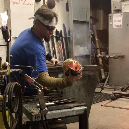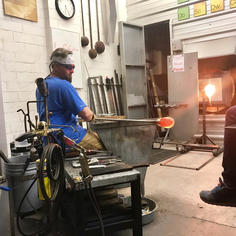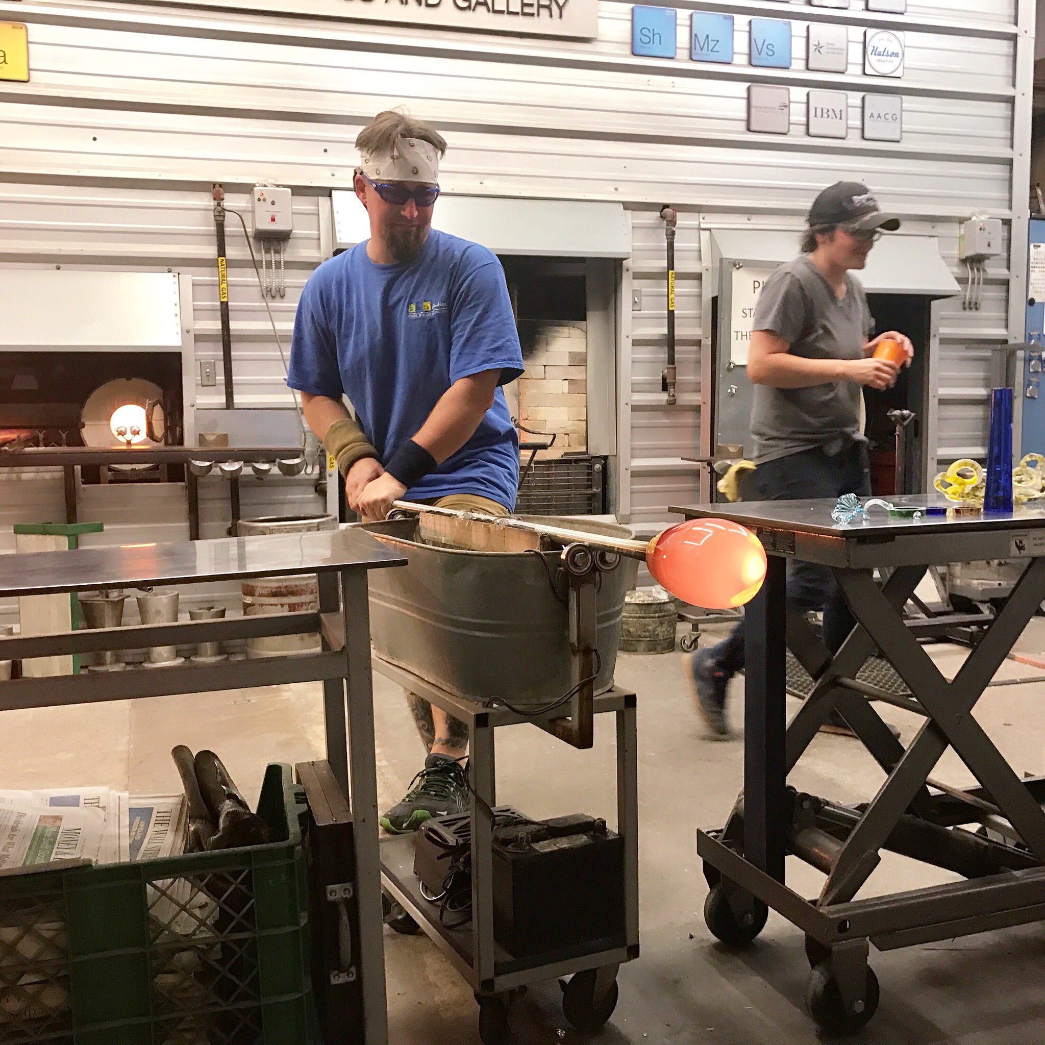 The studio is set up bleacher style. We came during the cooler season and sat in the back because temperatures in those ovens easily get to 2000 plus degrees making for a cozy warm atmosphere. We watched as the guys worked the glass (and when I say worked I mean WORKED). Their forearms have to be so strong because sometimes for an hour they will roll the glass on the blow stick constantly forming it, reforming it and molding it.