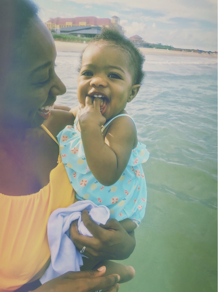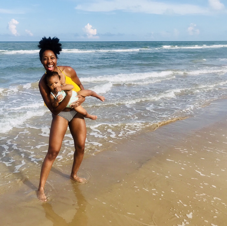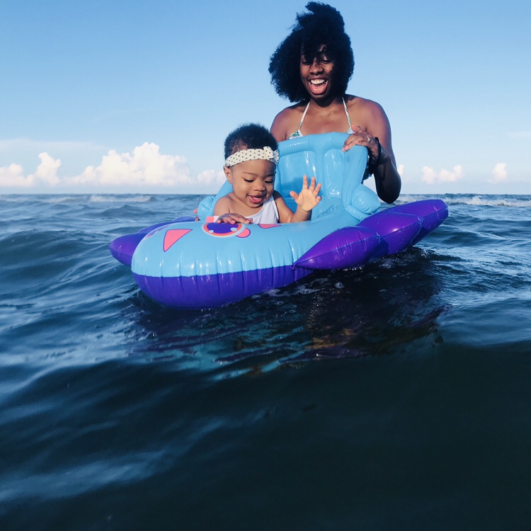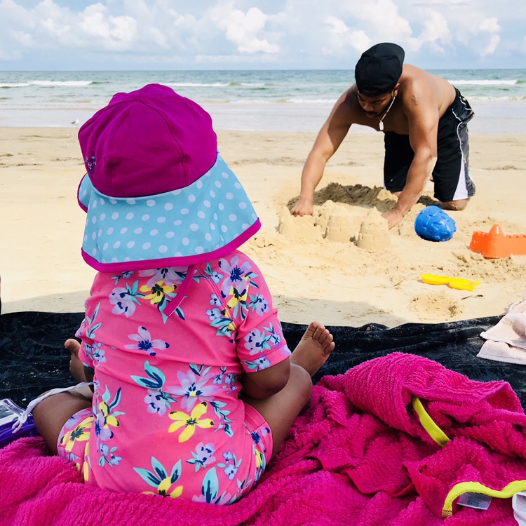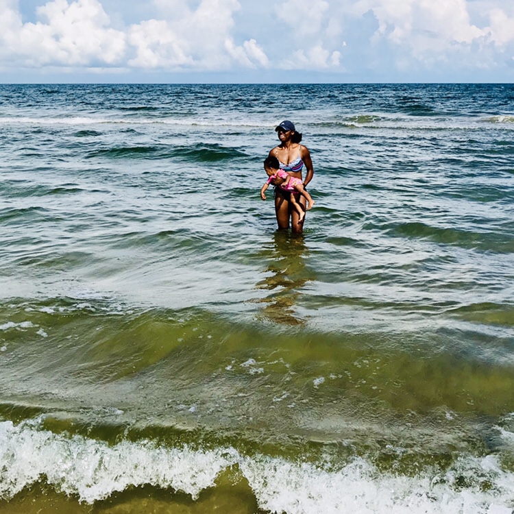 I couldn’t wait to experience us as a family going to the beach together for the first time. Stuffy nose and all, as soon as we got unpacked, we headed straight for the water. A big smile immediately spread across Buzzy Bee’s little face as we got closer and closer to what I would refer to as a giant tub.