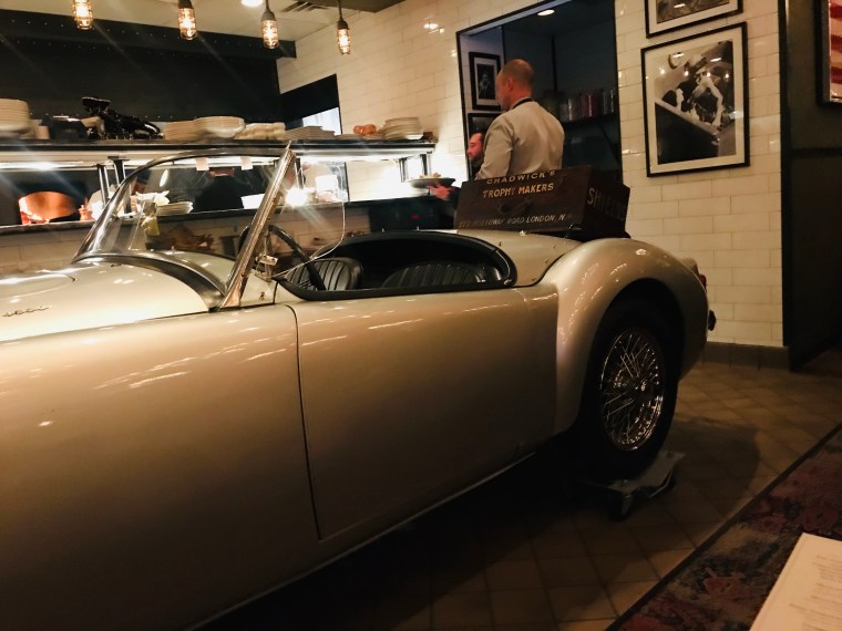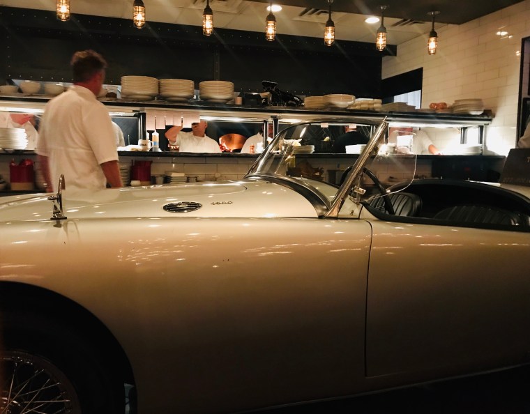 This will easily be a favorite spot for me. It’s a little more unassuming at first, but once you walk inside you’re greeted by a massive room romantically lit with beautiful chandeliers! They are everywhere (64 to be exact). We were seated right next to the buzzing kitchen and the 1961 MG-A Convertible parked right at the center.