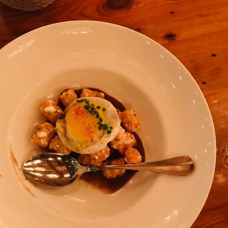 Not only was the atmosphere stunning, but the food….OH THE FOOD! To start, we got a Tot Poutine: A pile of tater tots on top of gravy with a sunny side duck egg on top. Yum!! And hubby had the nerve to ask if I wanted to start with a salad LOL!