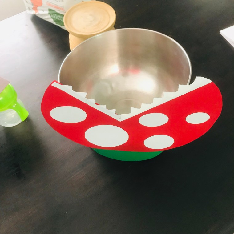 I brought out a large bowl and stood it on a cheesecake container to act as my pipe. I circled the pipe with green paper and then cut a huge circle in red paper and attached teeth and dots. Since people would only see the front I just taped the plant to the front and let that work its magic.
