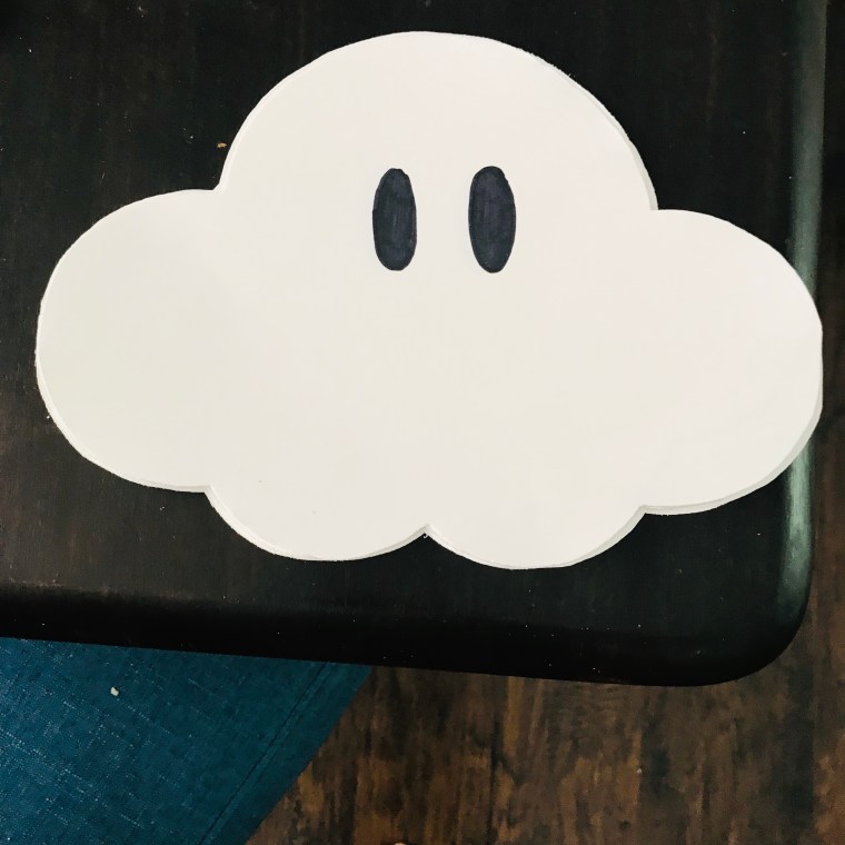These were so cute and simple. A quick google search for “Mario clouds” yielded me the results I was looking for. I made a page size printout and then traced it onto more card stock and my awesome hubby cut them out. Then to finish I just filled in the eyes with a black sharpie.