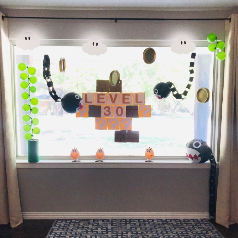 Once inside, she stepped into the real life world of Mario. I had spent the last few days decorating our huge picture windows with bricks, coins, question blocks, clouds, Goombas, Chain Chomps, gold stars, and pipe vines.