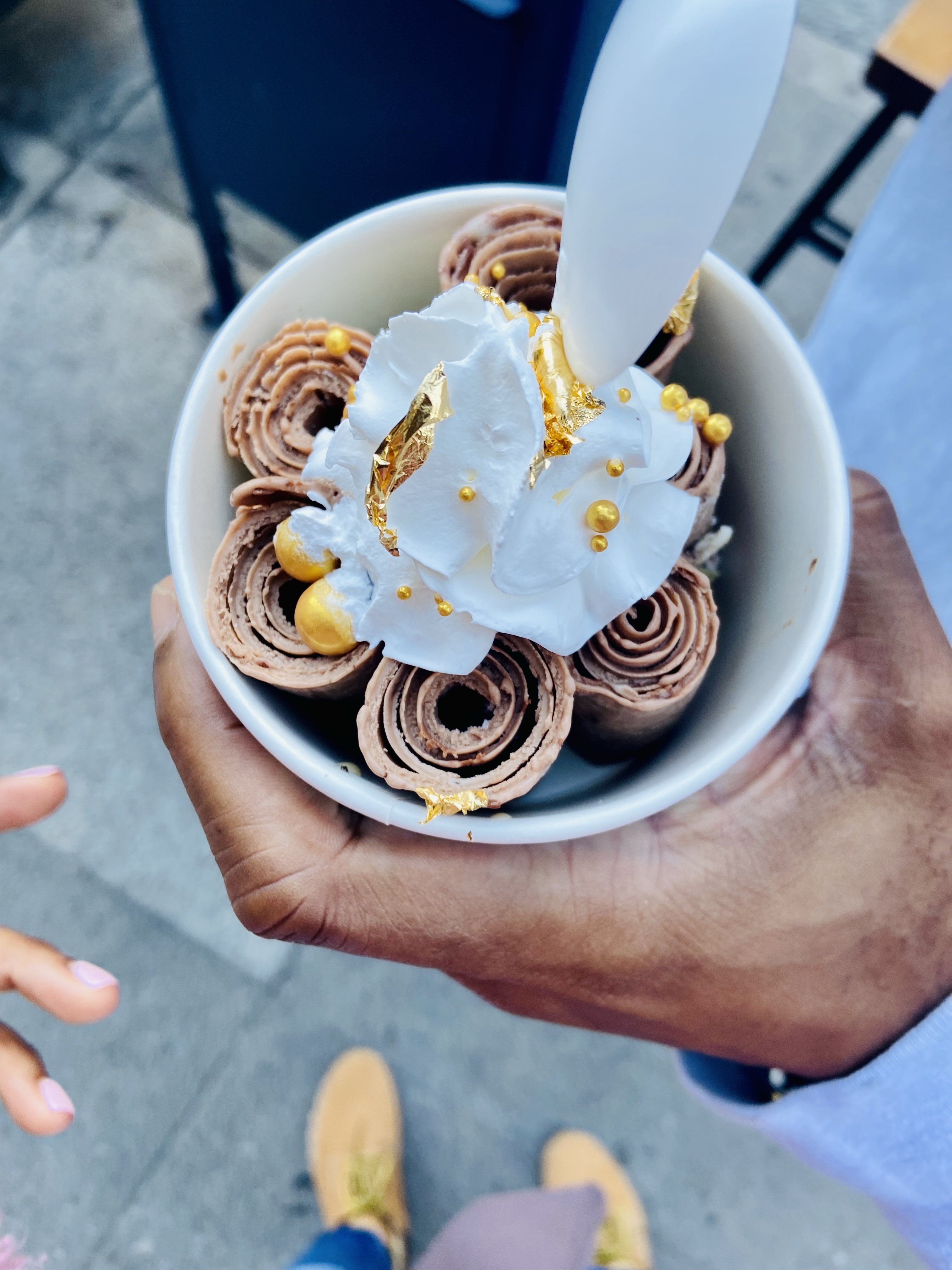 First they dump the ice cream on a cold griddle. Then they mix, spread, and flatten it across the griddle to make a thin frozen layer. Then they take what looks similar to a putty knife and pre cut lines into the layer and then use the knife to curl the strips upward into rolled frozen ice cream. Lastly they top it with whip cream and in our case edible 24k gold and voilà, enjoy!