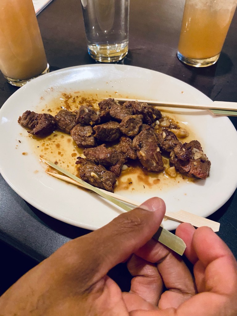 We ordered a couple of drinks and an appetizer to start. The dish was called Filet Mignon Bites. Now before you keep scrolling to see this dish, think about in your mind what that seems like it should look like…Ok got a pic in your head?? Keep scrolling…