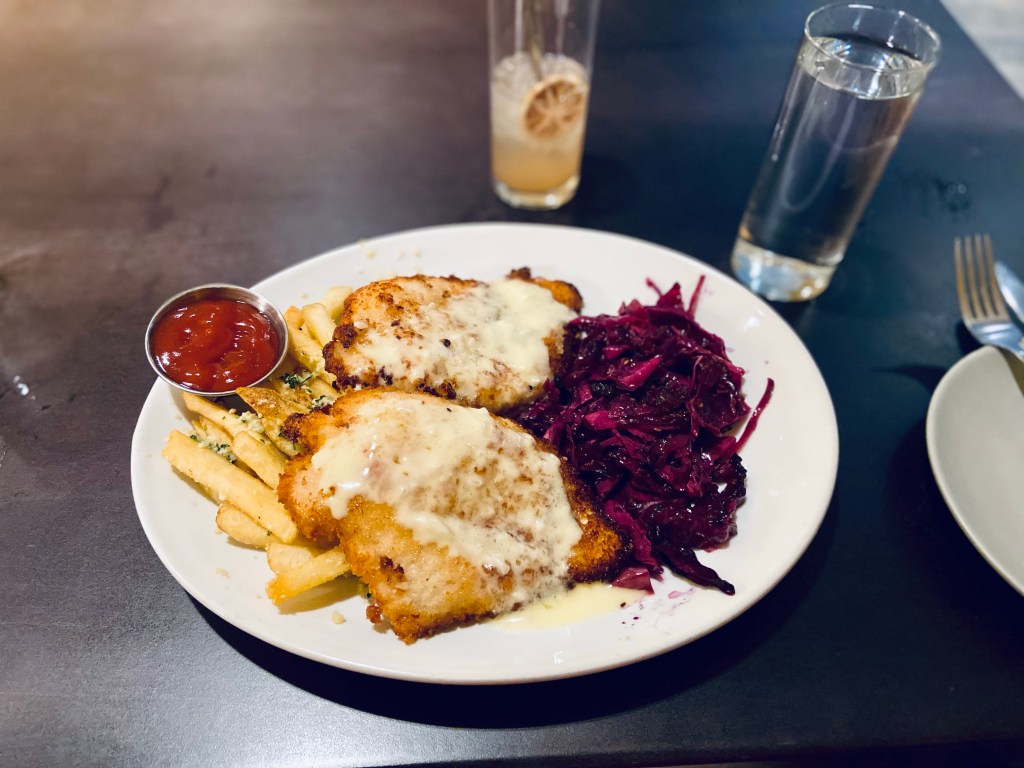 The dish I got was called a Chicken Schnitzel. It’s a breaded chicken breast with bacon braised red cabbage, lemon burre blanc, and truffle fries. First off, my chicken arrived with the lemon burre blanc already on it AND I tasted zero lemon…just butter. The fries were good, the cabbage was good, but what a shame the main dish was super sub par smh.