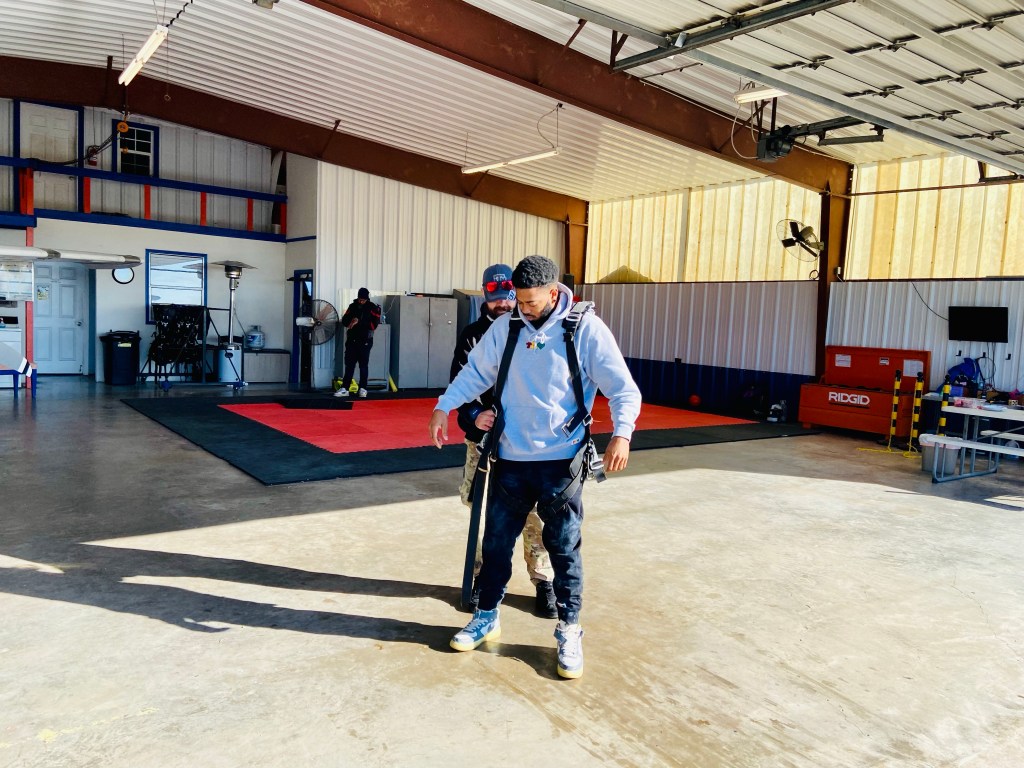 He got the mister all strapped up with his proper gear, gloves, and eye protection. We were the only ones there since it was in the morning so that gave RJ plenty of space to get a grasp on his training for the tandem jump.