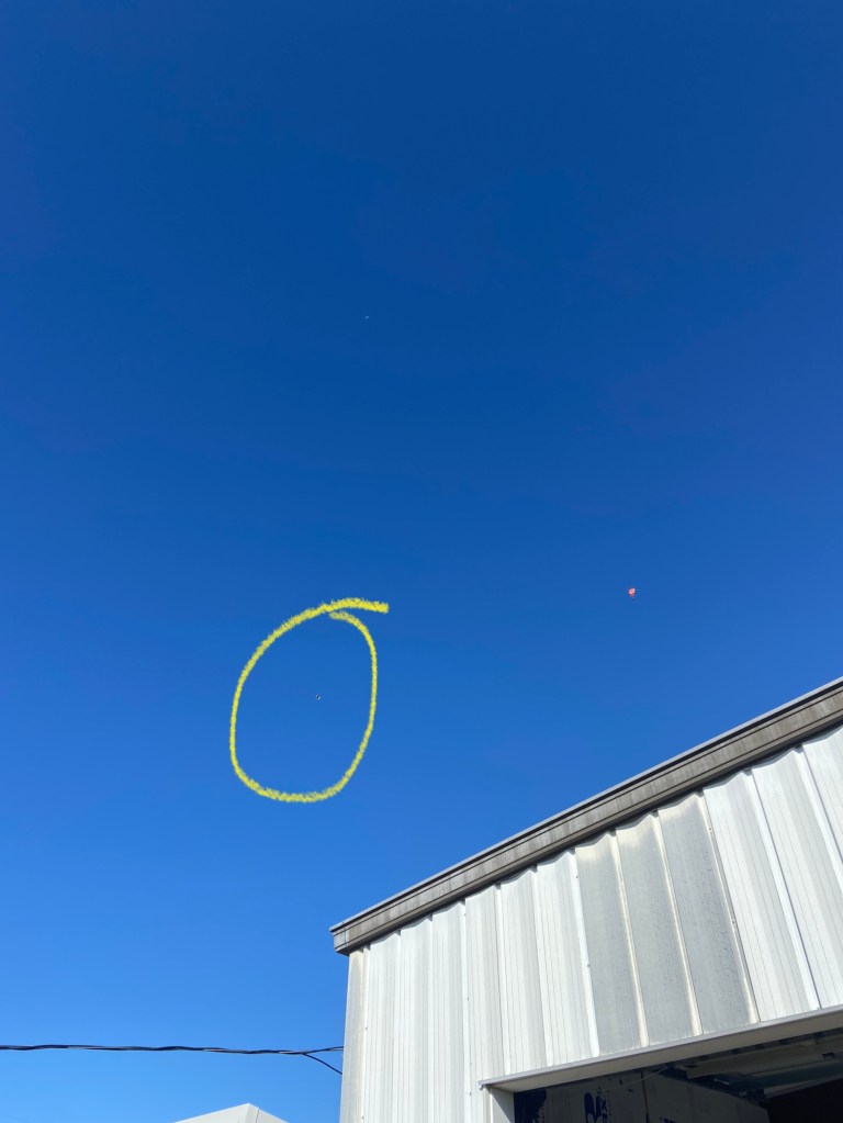 It felt longer than I anticipated. The plane circled twice, climbing higher in the air with each full round. On the second curve the jump finally happened! I found myself tensely squinting into the sky praying for all to be well. FINALLY I was able to spot them waaaay off in the distance. I saw the parachute floating closer and closer back towards the hanger. They swooped in with a perfect ease of a landing and I took an unknowingly held breath.