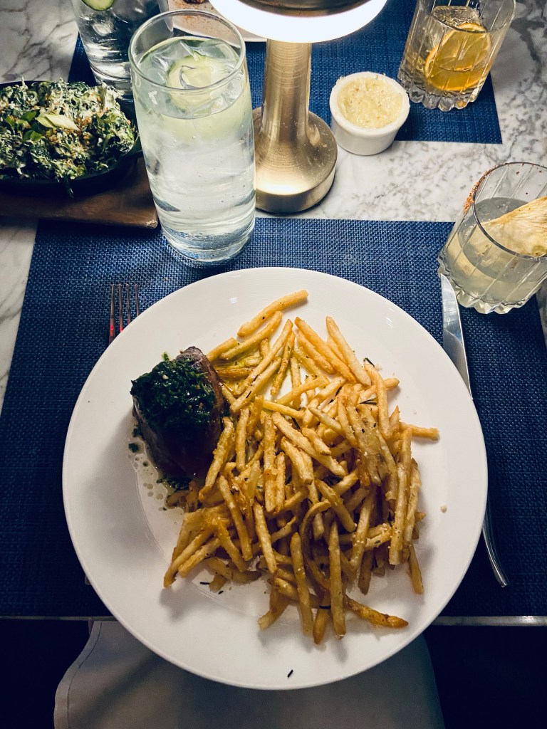 RJ had zero shame going for their NY Strip with a side of creamed spinach. I chose the Steak Frites which comes topped with a delicious chimichurri. We dined away enjoying every bite. I will say Wicked Butcher is more than just the food, the experience of it is just all around clean and swanky.