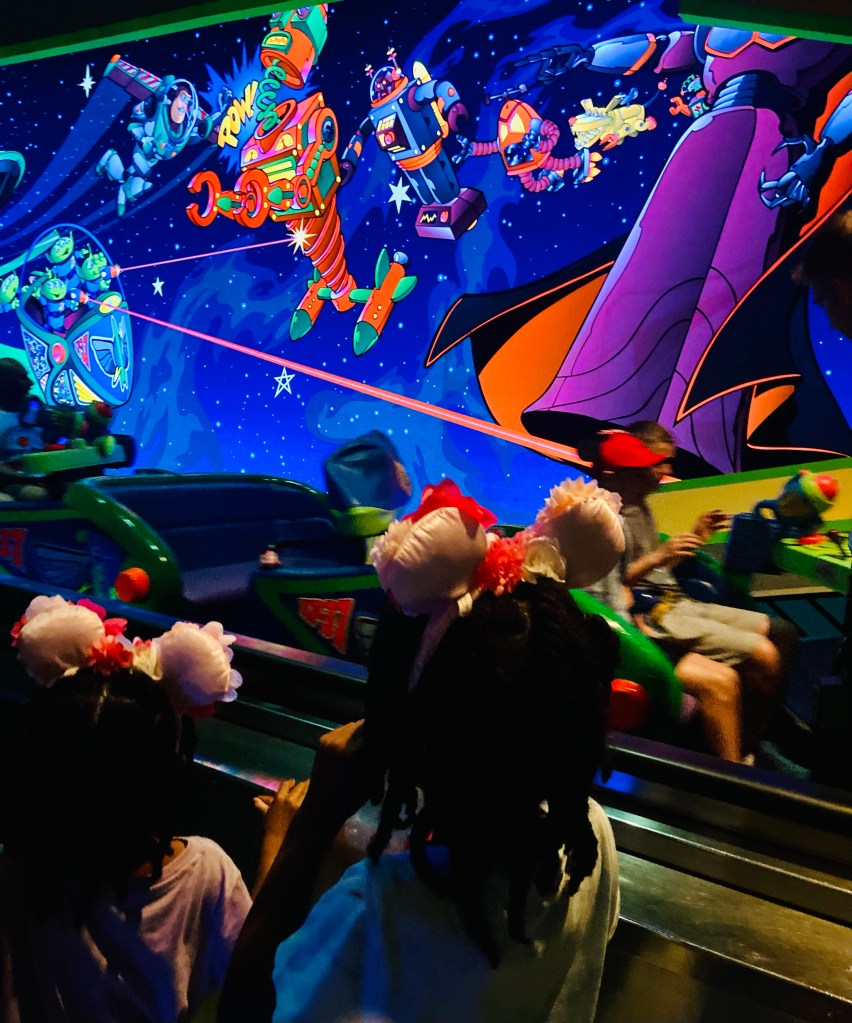 After the Laughing Floor, we ventured next door for the Buzz Lightyear Space Ranger Spin. If going on this ride, be sure to aim high for the best chance at a better score.