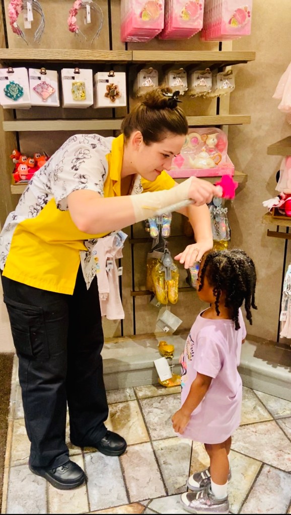 Before our Peter Pan ride, we headed over at Sir Mickeyโs Shop to have the girls get pixie dusted. This was a cute tip I found on a blog. A cast member will take a magic wand and sprinkle glitter in whoeverโs hair per your request. It will be a nightmare to wash out, but it was worth the fun little treat for their sake.