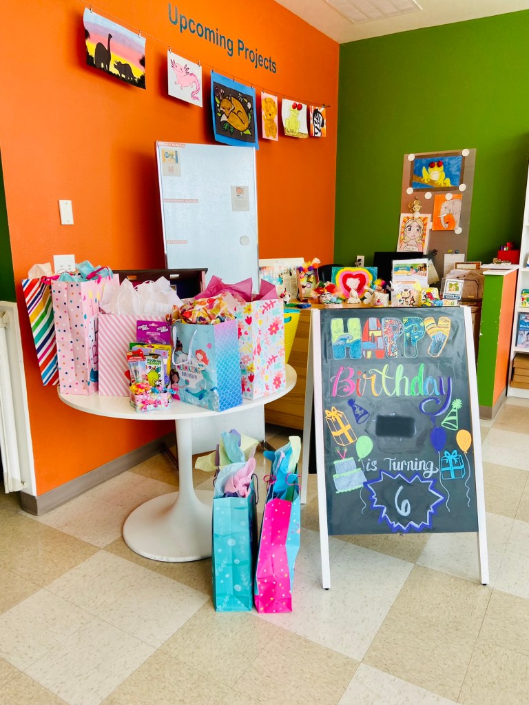 On the final celebration day, I gathered up the cake, picked up the balloons, and headed over to Kid Create Studio Mansfield to set up for Bee’s artsy party.