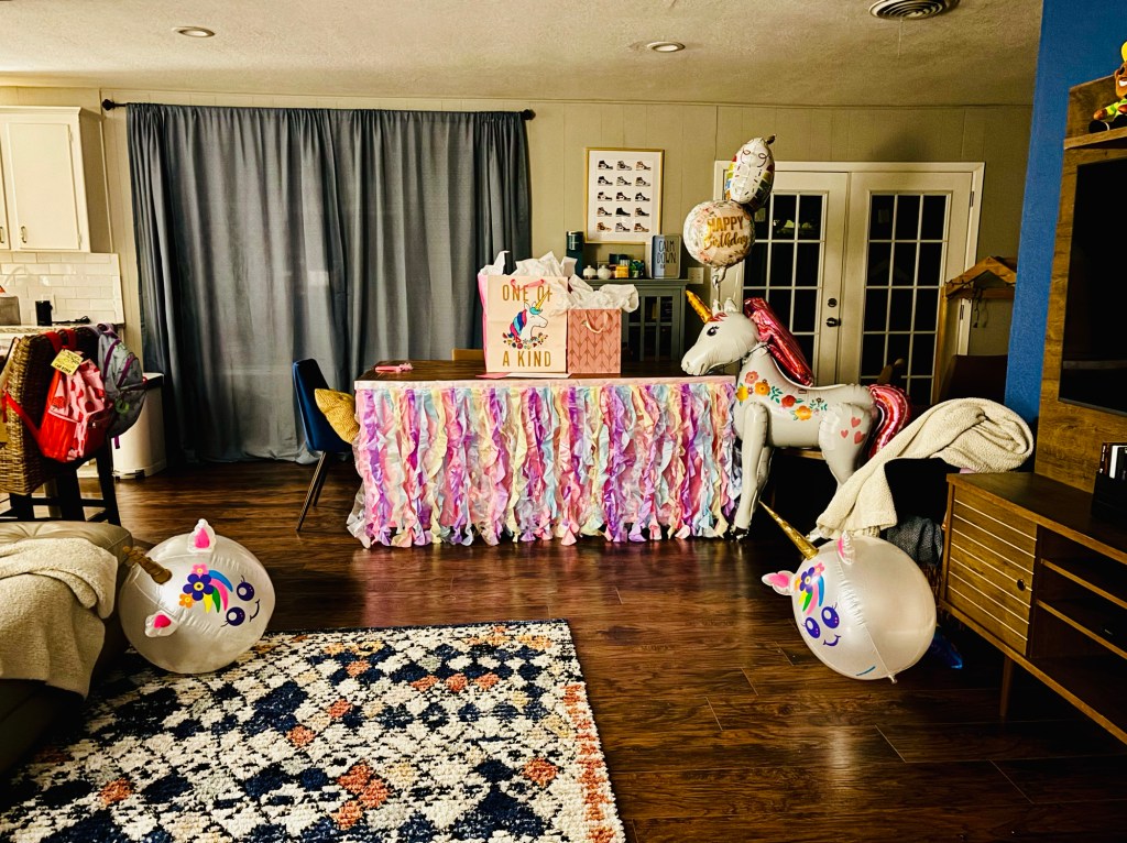 Even though we partied late, I stayed up to prep for part 2 of her two day celebrations. Once she was in bed, I broke out a fun rainbow table skirt, a 46 inch Unicorn air walker foil balloon and even some Unicorn beach balls.